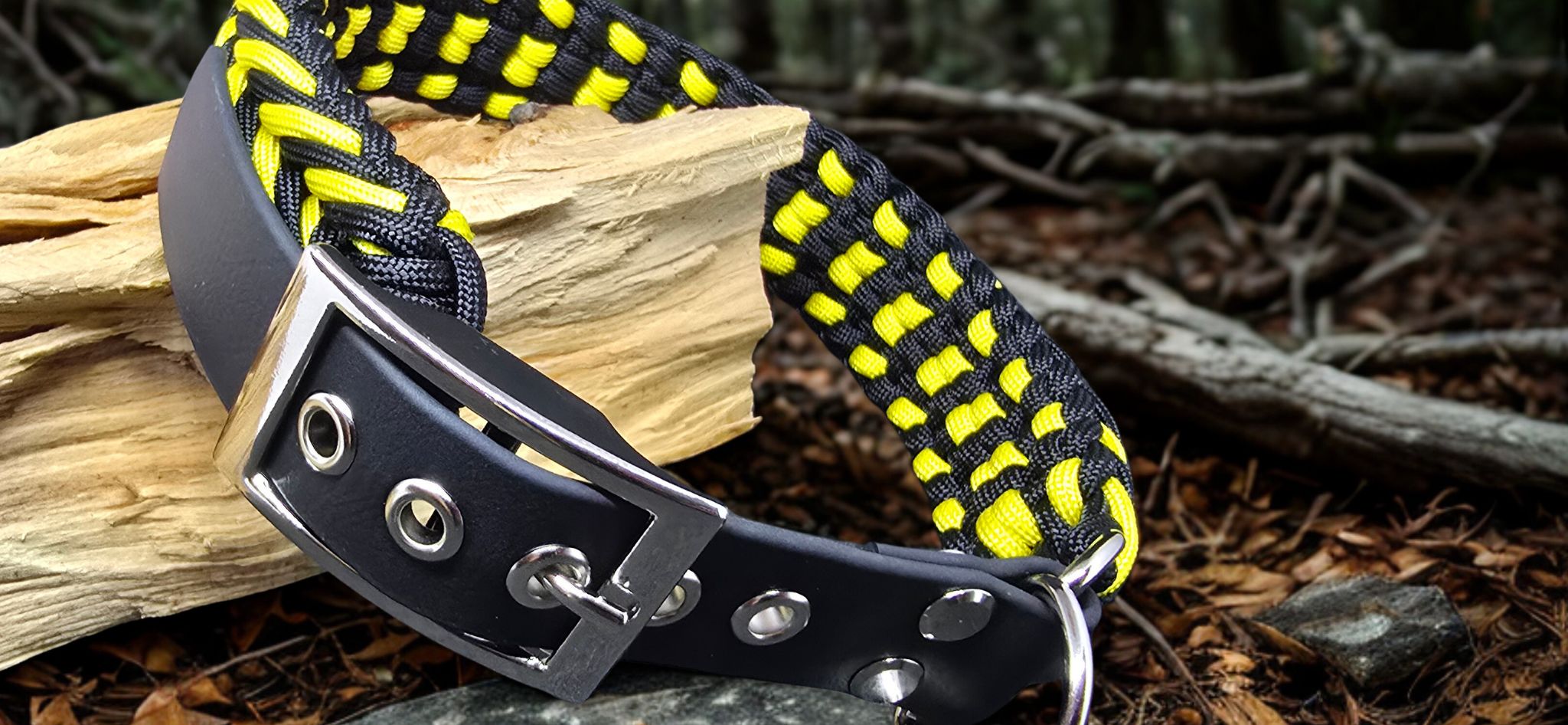 Collier artisanal robuste, alliant le style de la paracorde et la praticité du biothane étanche.
